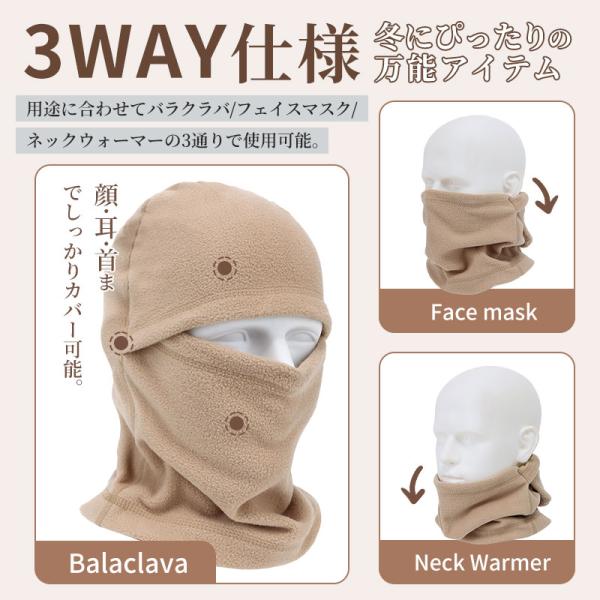 本製品は、暖かいフリース素材を採用した3WAYバラクラバです。