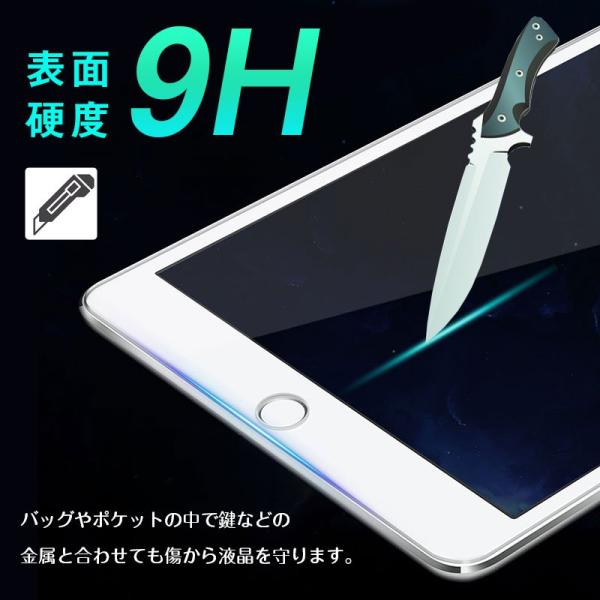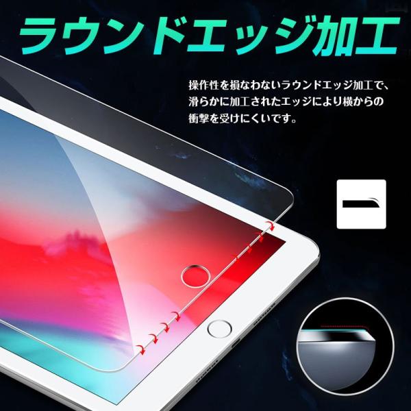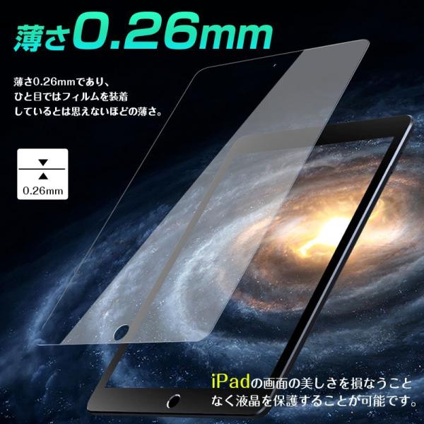 表面硬度9Hで鋭利な刃物でも傷がつかない程の硬度を持っております!薄さ0.26mmであり、ひと目ではフィルムを装着しているとは思えないほどの薄さ。iPadの画面の美しさを損なうことなく液晶を保護することが可能です。操作性を損なわないラウンドエッジ加工で、滑らかに加工されたエッジにより横からの衝撃を受けにくいです。iPadの液晶本来の美しさをけして損ねることのない高透明度のフィルムなので撮った写真や動画、ゲームなどを高画質のままお楽しみ頂けます。指紋の付着を防ぎ、画面を美しいまま保てる特殊コーティングを施しています。また、油分や水分にも強く付着した水滴や汗・化粧品などを簡単に拭き取ることが可能です。気泡が入りにくいので、フィルム貼りが苦手という方にも安心!