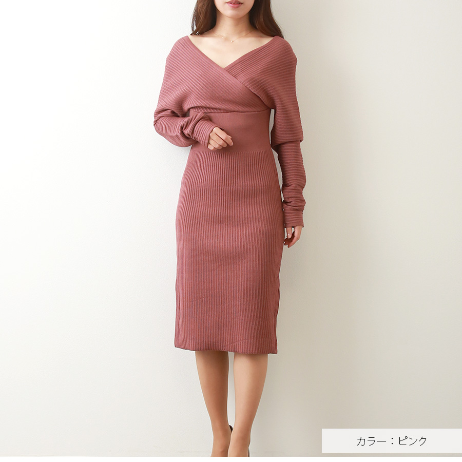 ニットワンピース タイト カシュクール風 Vネック 長袖 ロング ピンク レッド カーキ フリーサイズ 9238