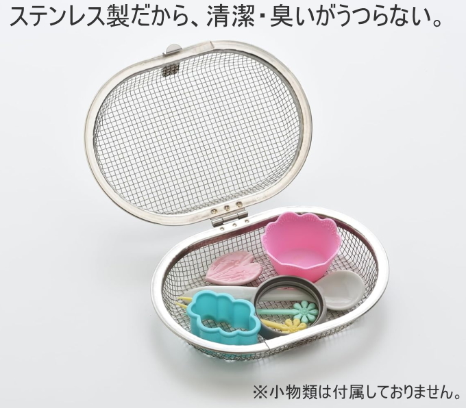 おかずカップやピック、水筒のパッキンなど、食洗機で洗いにくかった小物類を一つにまとめて洗うことができる便利なステンレスカゴです。