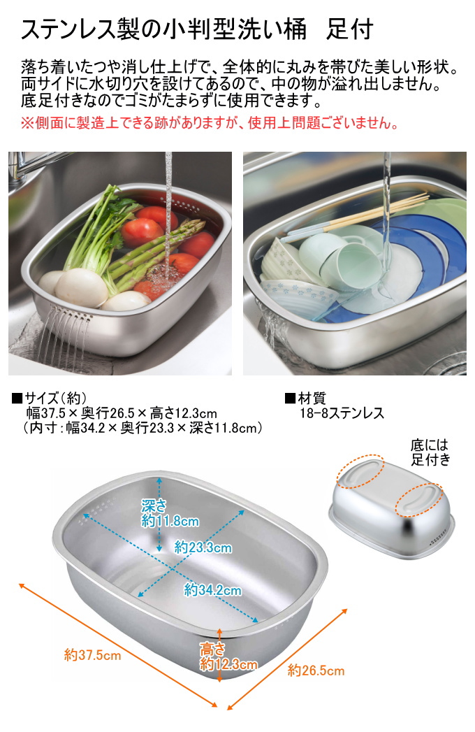 ステンレス製の小判型洗い桶 足付 43698 日本製 燕三条 ステンレス つや消し 底足付 水切り穴 18-8ステンレス キッチン シンク周り 下村企販