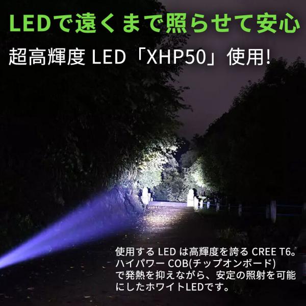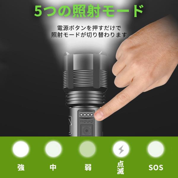 電源ボタンを押すだけで、高輝度、中輝度、低輝度、フラッシュ、SOSモードを調節可能です。身の安全確保には、安心です。ズーム機能が付いています。
