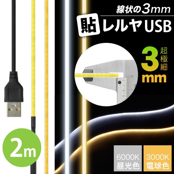 LED テープ ライト (送料無料)(超極細) 線状の3mm 貼レルヤ USB(昼光色/電球色 2m)6000K/3000K 好きなサイズに切れる 色々な場所に貼れる USB電源 照明