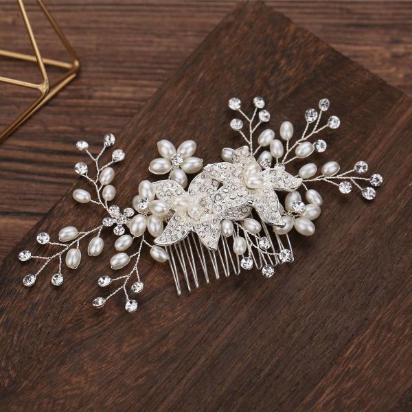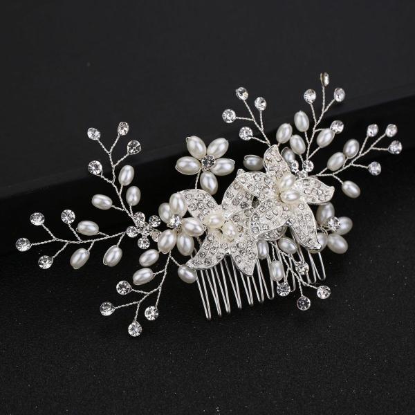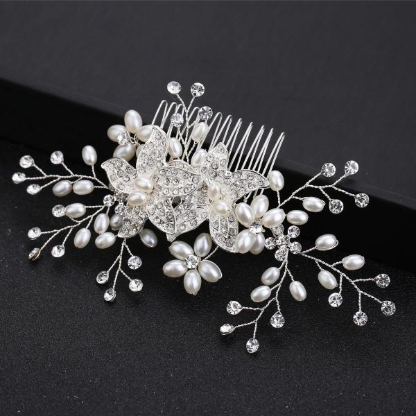 フラワービジューとパール・ラインストーンを丁寧にはめ込んだヘアコームです。