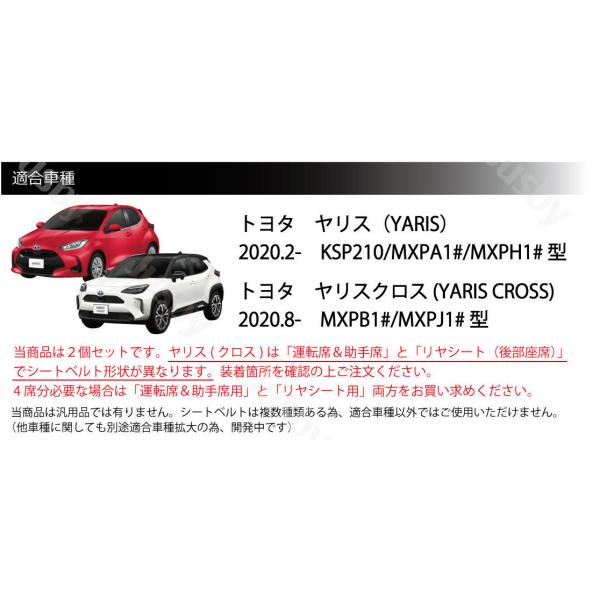 当商品は2個セットです。 ヤリス (クロス)/GRヤリスは「運転席&助手席」と「後部座席(真ん中除く)」でシートベルト形状が異なる為、フロント用・リヤ用で別々の販売となっておりますのでご注意ください。