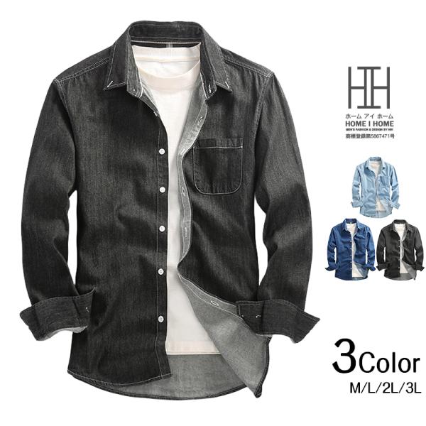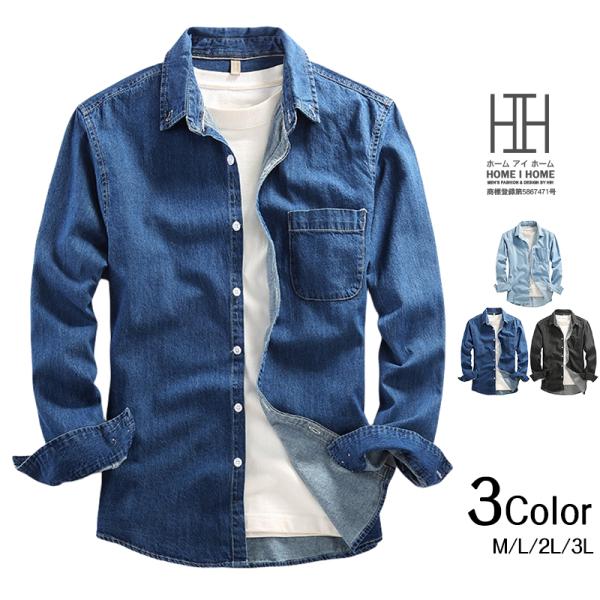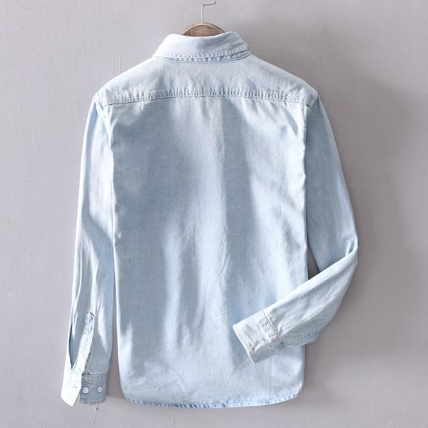 デニムシャツ カジュアルシャツ メンズ 長袖 ワークシャツ 綿100% ヴィンテージ ユーズド加工 色落ち お兄系 柔らかい ウォッシュ加工 作業服 ポケット付き