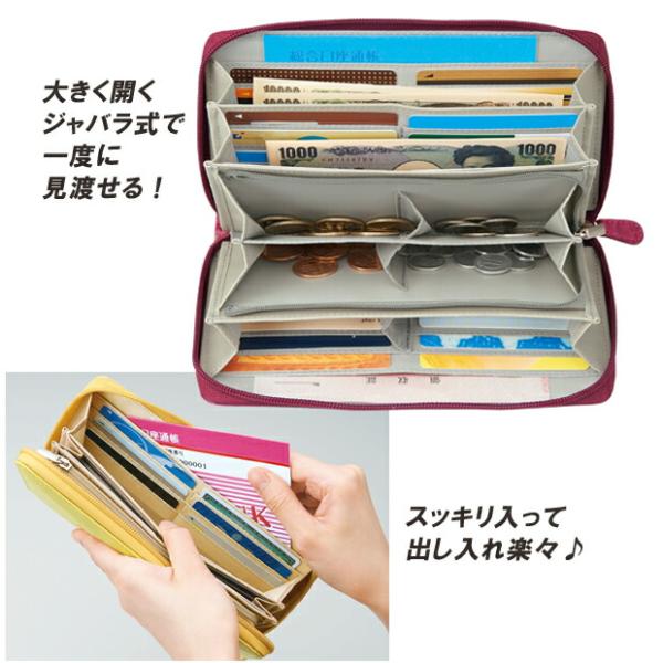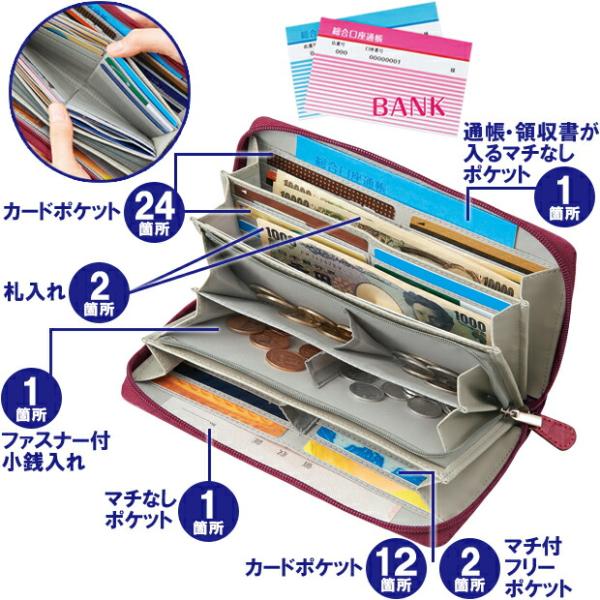 ファスナー式開閉、内:札入れ×2・ファスナー式小銭入れ×1・オープンポケット×4・カード入れ×36、外:オープンポケット×1