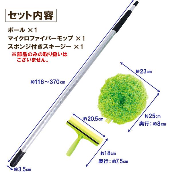 ポール:φ3.5×長116〜370cm、モップ:25×8×23cm、スキージー:18×7.5×20.5cm