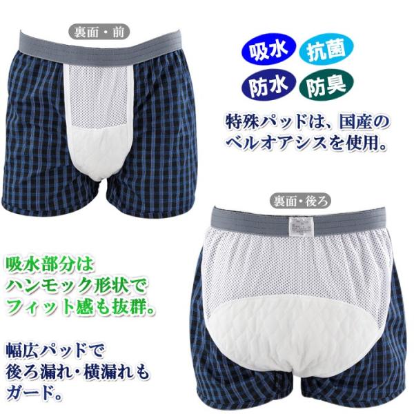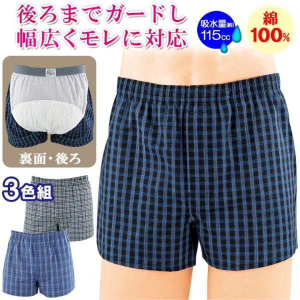 中失禁 尿漏れパンツ 失禁パンツ 男性用 ロングパッド 綿100 安心パンツ おしりまで安心失禁トランクス 3色組