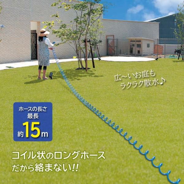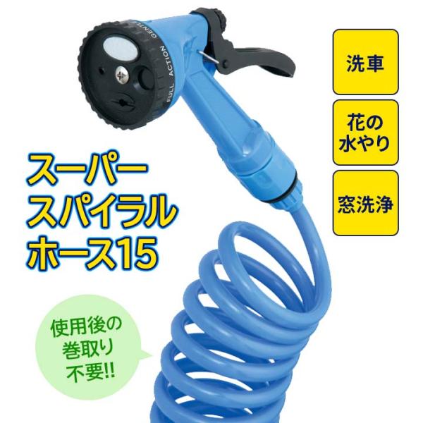 伸縮ホース 巻取り不要 コイル状 ロングホース 水やり 水まき 散水 洗車 洗浄 園芸 掃除 ガーデニング 絡まない スーパースパイラルホース 15m ブルー