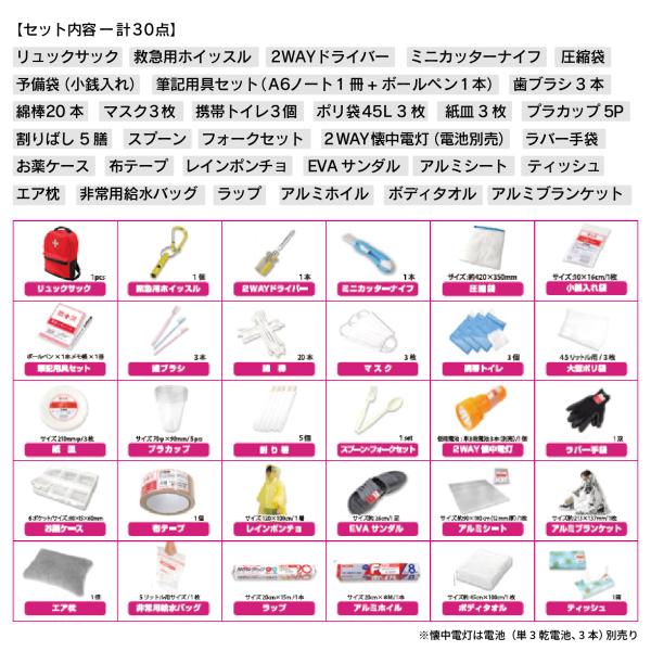 ・リュックサック ・救急用ホイッスル ・2WAYドライバー ・ミニカッターナイフ ・圧縮袋 ・予備袋(小銭入れ) ・筆記用具セット(A6ノート1冊+ボールペン1本) ・歯ブラシ 3本 ・綿棒 20本 ・マスク 3枚 ・携帯トイレ 3個 ・ポリ袋45L 3枚 ・紙皿 3枚 ・プラカップ 5P ・割りばし 5膳 ・スプーン・フォークセット ・2WAY懐中電灯(電池別売) ・ラバー手袋 ・お薬ケース ・布テープ ・レインポンチョ ・EVAサンダル ・アルミシート ・アルミブランケット ・エア枕 ・非常用給水バッグ ・ラップ ・アルミホイル ・ボディタオル ・ティッシュ 計30点