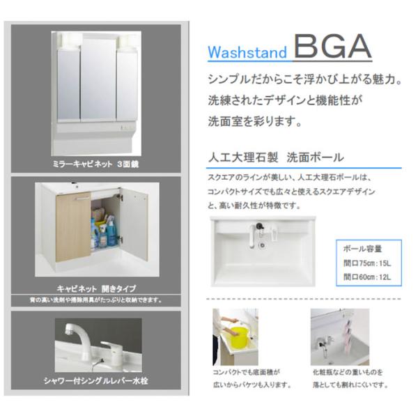 クリナップ 洗面化粧台BGA W750 下台 BGAL75TNTVWJTSI ミラー M-H753GAEH 三面鏡 シャワー付シングルレバー水栓 LED照明