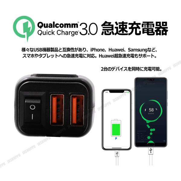 バイク用 QC3.0 急速充電器 USBチャージャー LED電圧計搭載 電源ON/OFFスイッチ付 スマホやタブレットの充電に 汎用