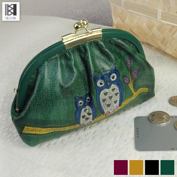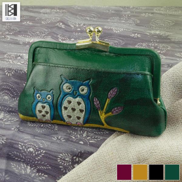 がま口 財布 レディース 小銭入 ふくろう 本革 日本製 和装 縁起財布 横長 開運 親子がま口 淀川染 がま口工房mami