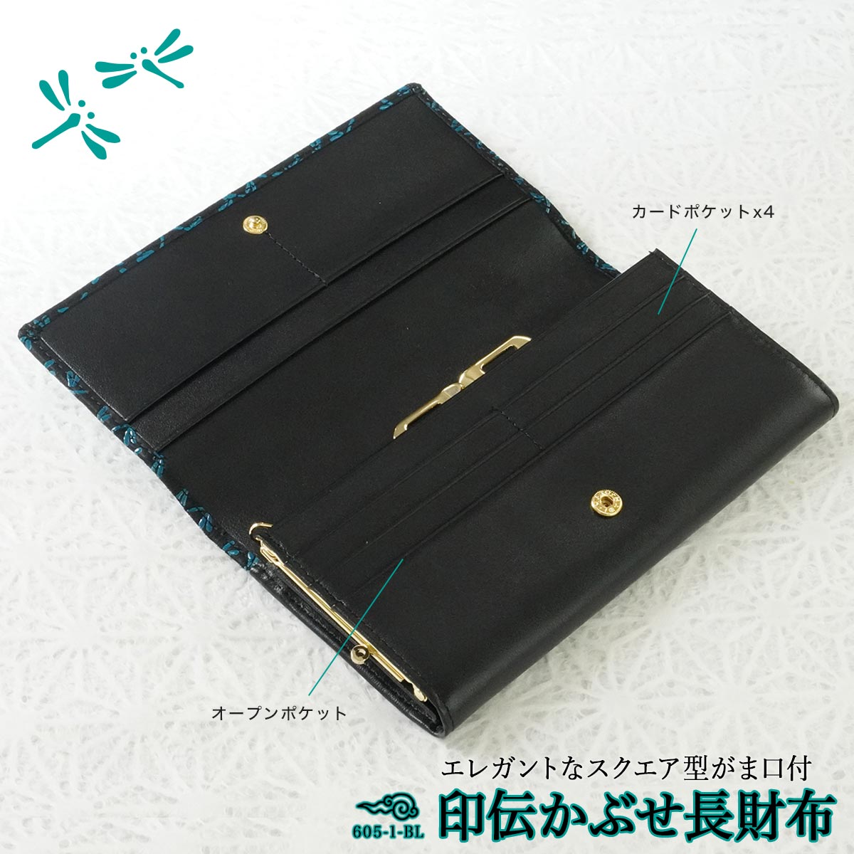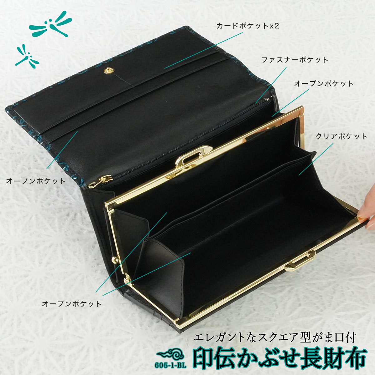 長財布 印伝 かぶせ レディース 大容量 がま口 スクエア型 口金 青 ターコイズブルー とんぼ 鹿乃香印傳 がま口工房mami