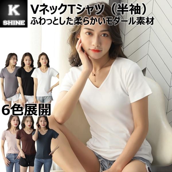 【3点で10%クーポン】 Tシャツ Vネック 半袖 レディース 無地 6色 レーヨン インナーT 女性 ワイドネック 柔らかい 白 黒 [SMT(VN)(S)]