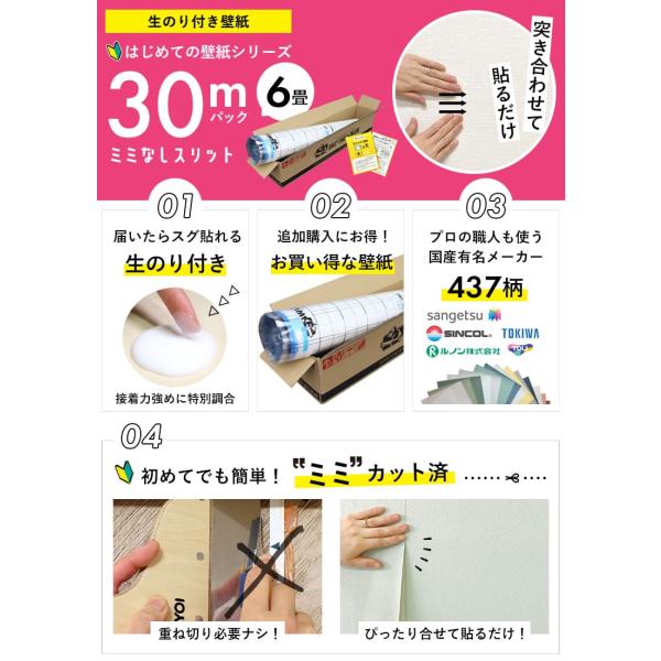 壁紙 のりつき「スリット壁紙 ミミなし」のり付き クロス 壁紙 おしゃれ 437柄「生のり付き壁紙だけ30 mパック」+マニュアル 初心者 壁紙貼り替え 6畳壁紙