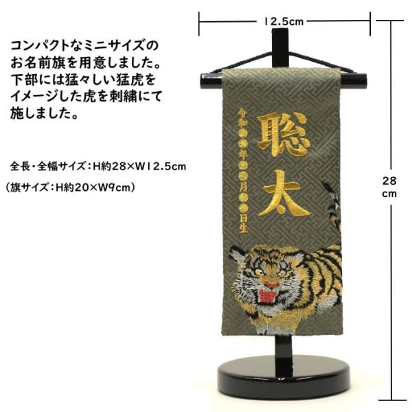 名前旗 男の子 刺繍 五月人形 猛虎 特小 グレー 金糸刺繍お名前 生年月日 総刺繍絵タペストリー 高さ28cm 端午の節句 節句用品 簡易包装無料 干支 虎 ミニサイズ