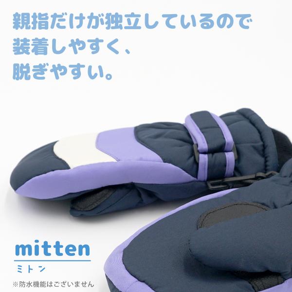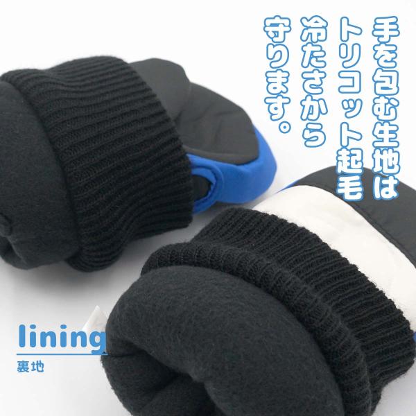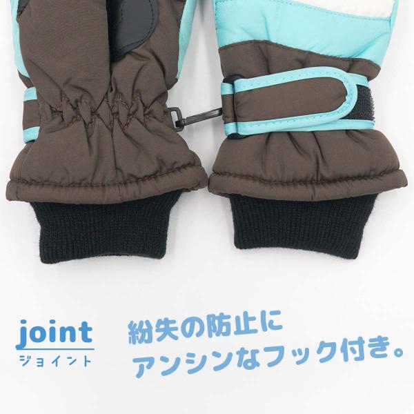 ・内側はフリースで暖か・ニットカフスで雪が入りにくい・手首のベルトで調節できます・紛失防止の左右フック留めで安心