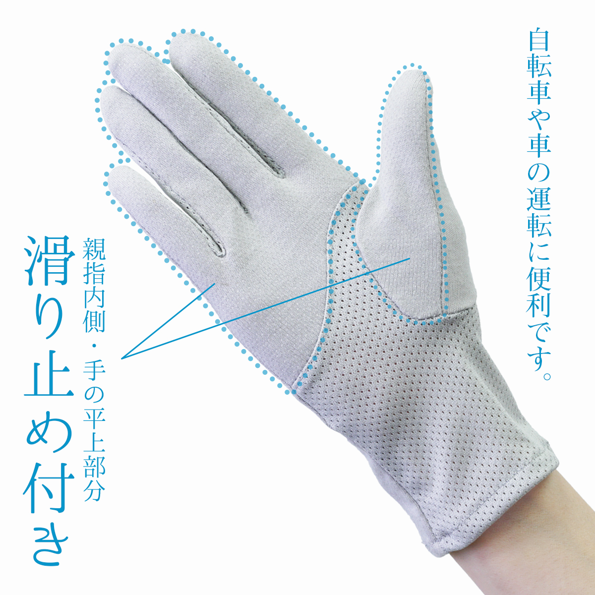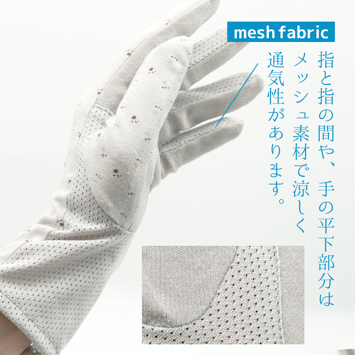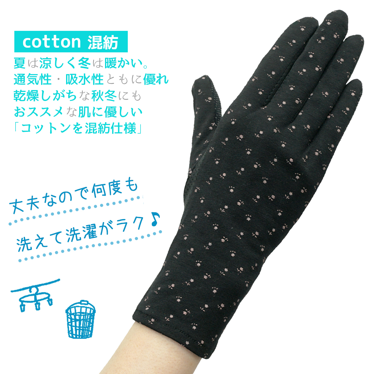 <商品特長>コットン100%の優しい肌触り※小花柄はポリエステル、ポリウレタン、コットンの混紡・季節を気にせずお使いいただけます・広い面の滑止付きで自転車などの運転にも安心・指の間や手の平はメッシュ素材で涼しく通気性抜群・丈夫な素材で速乾性に優れているので何度も洗えて洗濯もラクラク・洗い替えにお使いいただけます