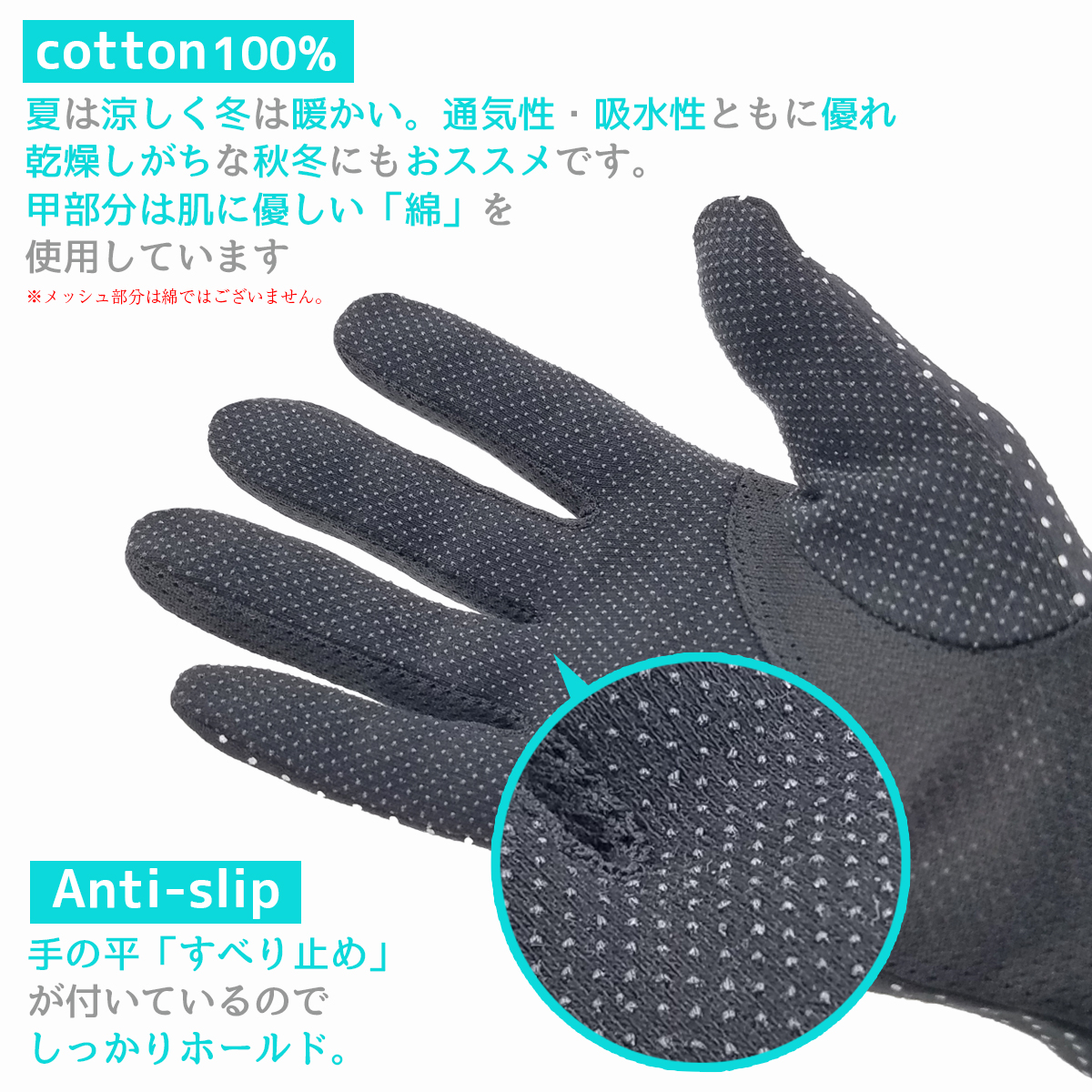 ・指の間や手の平はメッシュ素材で涼しく通気性抜群。