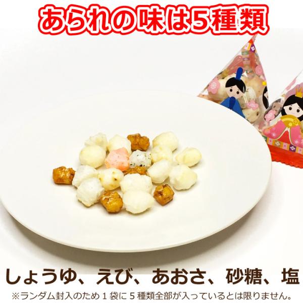 可愛らしいおひなさまのイラストがプリントされた小袋入りのあられです。