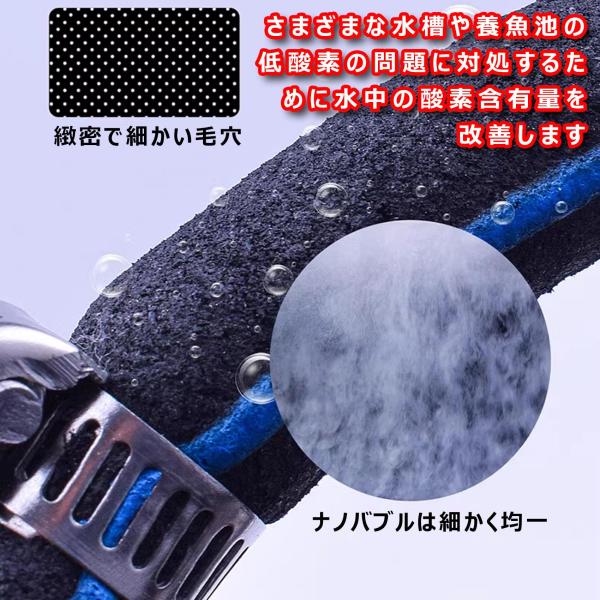 4.【細かい泡・酸素供給・水をきれいに】:ナノメートル加工なので、ムラなく細かい気泡が放出できます。水槽の中でブクブク泡が出ているので、水槽内に魚達の呼吸に必要な酸素を供給できます。水中に酸素が十分にいきわたることで、水槽内の水質を保ってくれる硝化バクテリアの働きが一層活発になります。