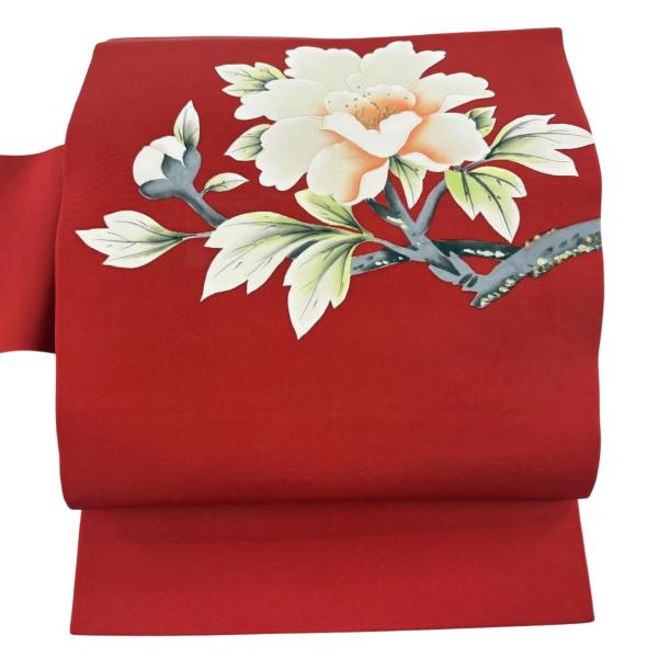 名古屋帯 優品 枝花 金彩 赤 正絹 中古