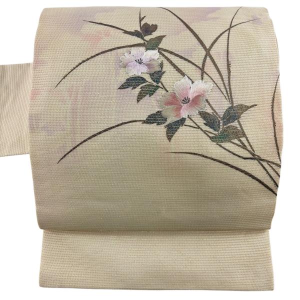 名古屋帯 優品 夏帯 絽 草花 シルエット 刺繍 金彩 ベージュ 正絹 中古