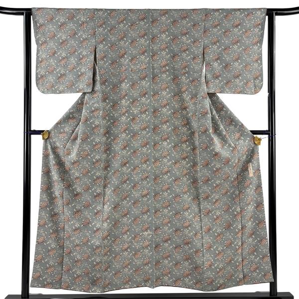 美品 小紋 身丈155cm 裄丈62cm S 袷 落款あり 花唐草 鳥 灰色 正絹 優品 中古