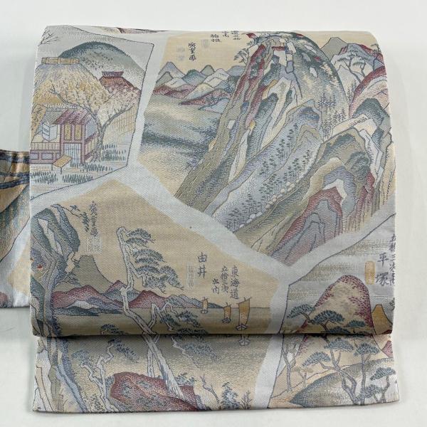 名古屋帯 優品 風景 文字文 灰色 正絹 中古
