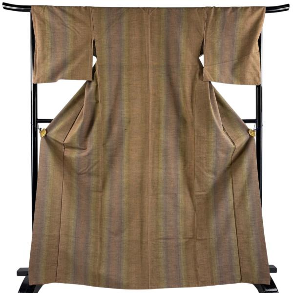 美品 紬 身丈168cm 裄丈67.5cm L 袷 縦縞 茶色 正絹 優品 中古