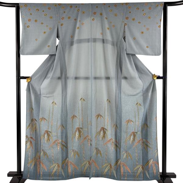 訪問着 身丈162.5cm 裄丈63cm S 薄物 洗える着物 絽 笹 梅 青灰色 化繊 優品 中古