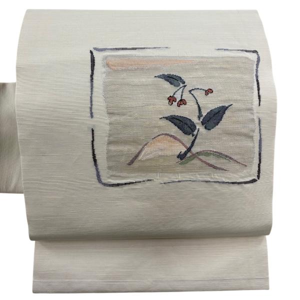 美品 名古屋帯 優品 関西仕立て 草花 灰白 正絹 中古