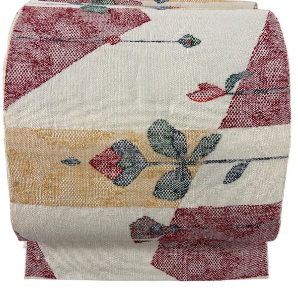 美品 名古屋帯 優品 松葉仕立て 八寸名古屋帯 紬地 草花 クリーム 正絹 中古