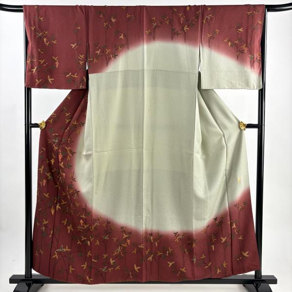 美品 訪問着 身丈156.5cm 裄丈67cm M 袷 落款あり 葉と実 地紋 金彩 染め分け えんじ色 正絹 秀品 中古