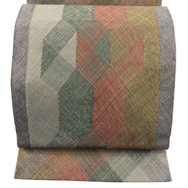 袋帯 秀品 幾何学 斜め格子 金糸 緑 お太鼓柄 正絹 中古
