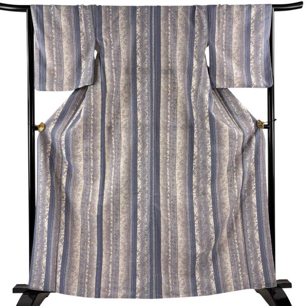 小紋 身丈164cm 裄丈66cm M 袷 洗える着物 縦縞模様 桜 青紫 化繊 優品 中古