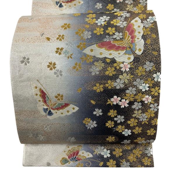 袋帯 秀品 振袖向き 蝶 桜 金銀糸 唐織 銀色 六通 正絹 中古