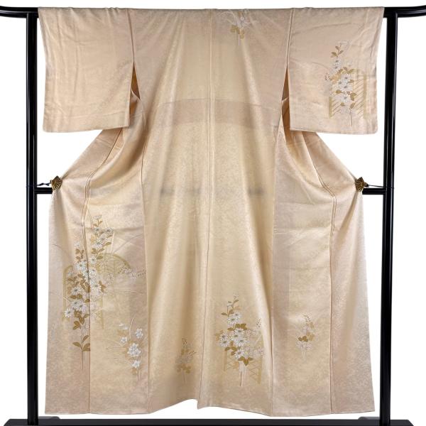 付下げ 身丈153cm 裄丈62cm S 袷 草花 間垣 金彩 ベージュ 正絹 優品 一つ紋 中古