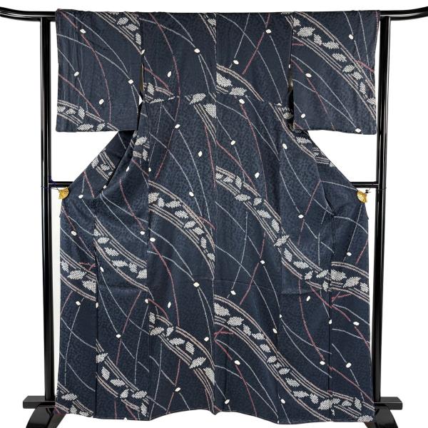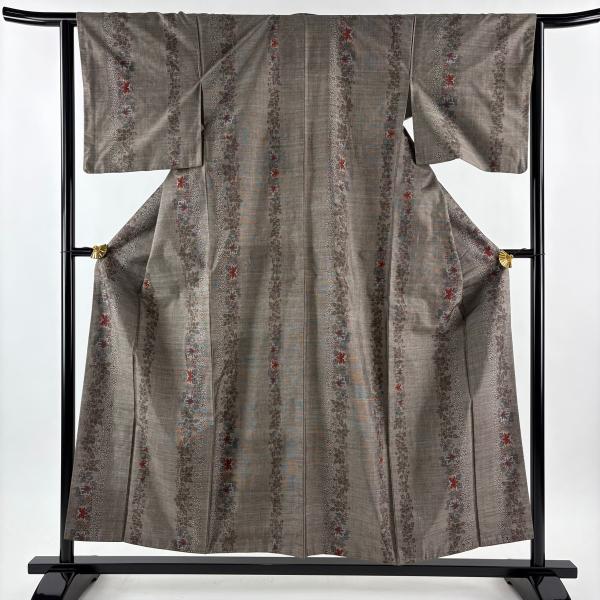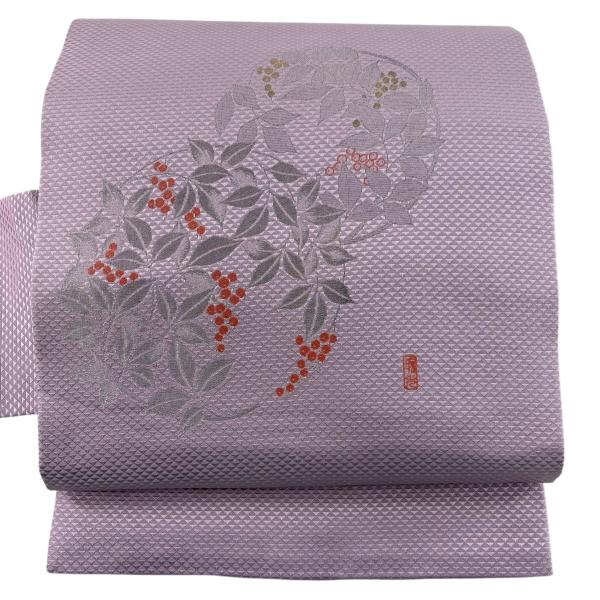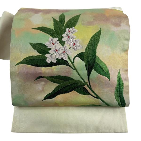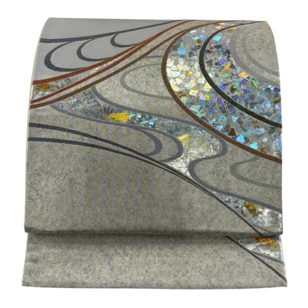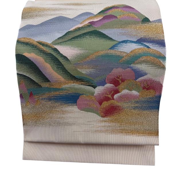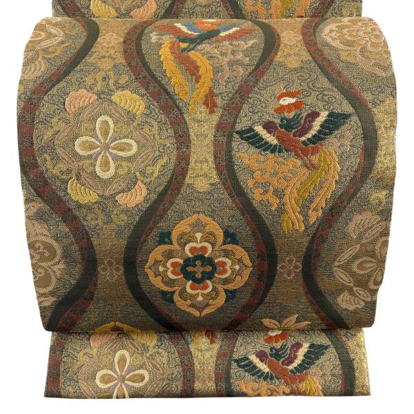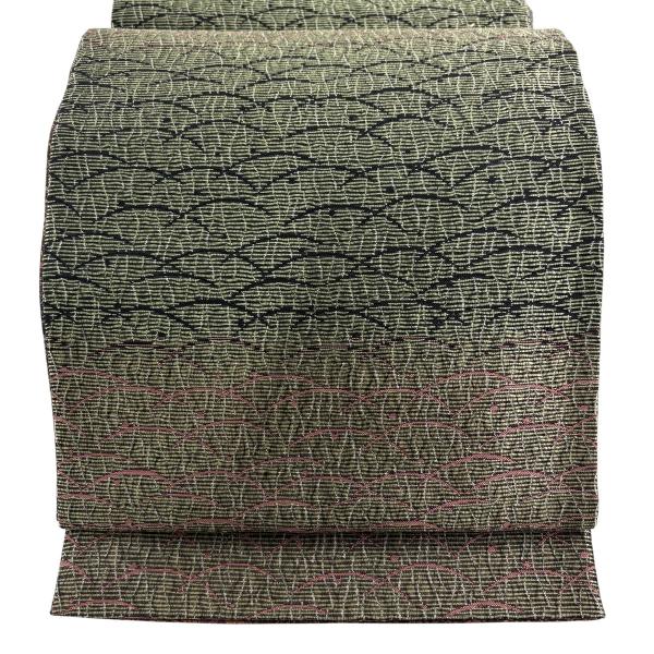 美品 袋帯 秀品 本泥草木染袋帯 縞 金糸 緑 六通 正絹 中古