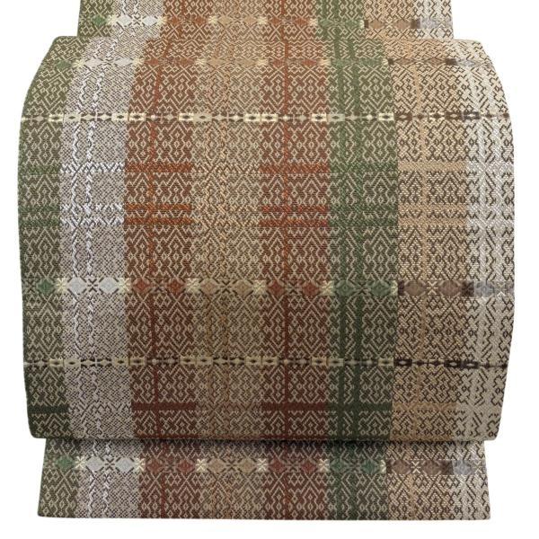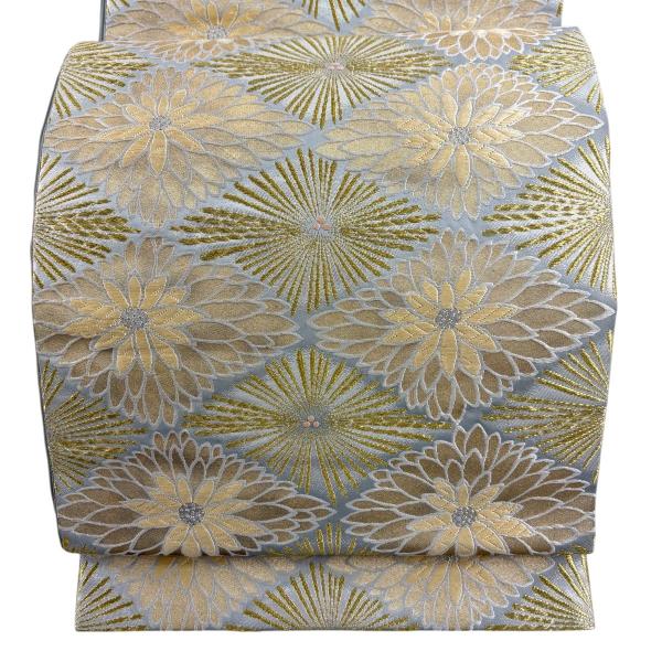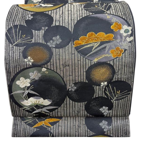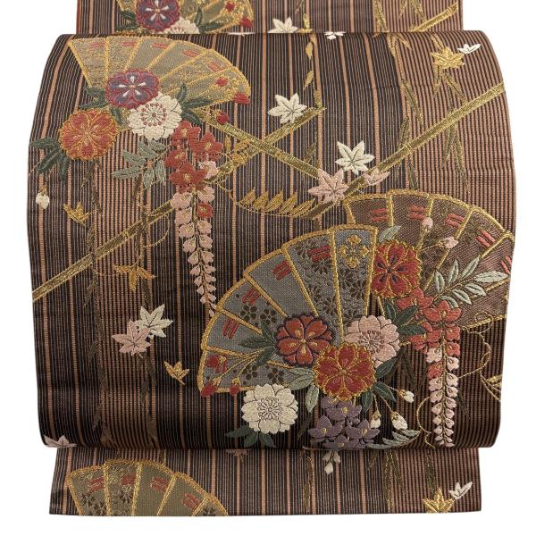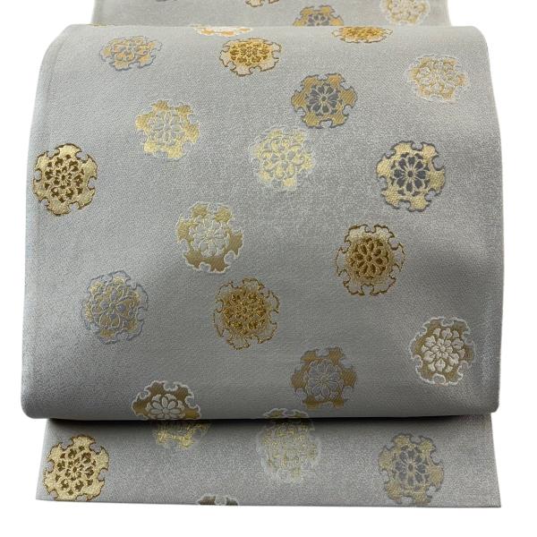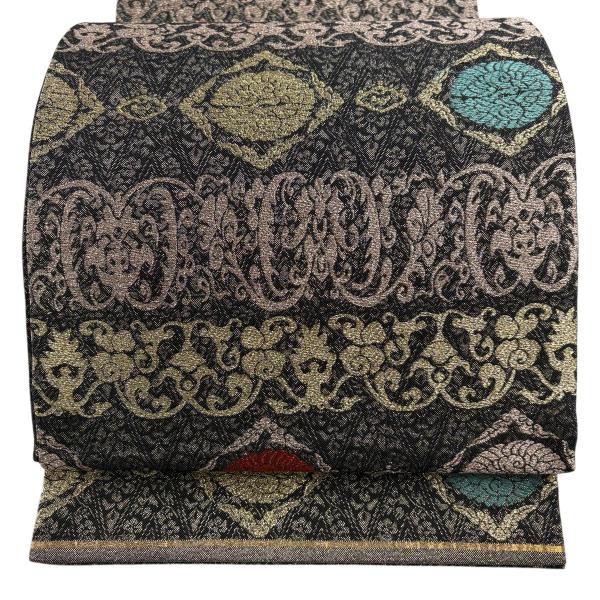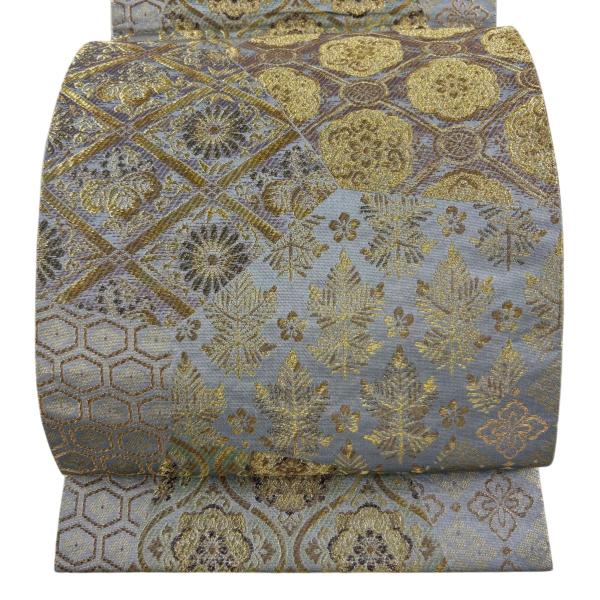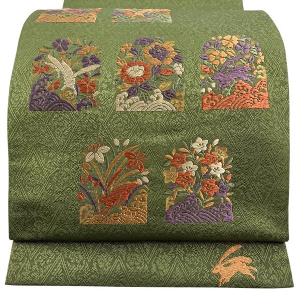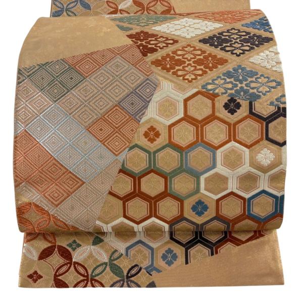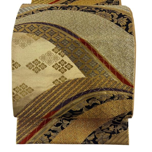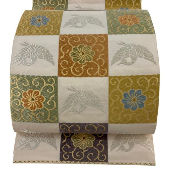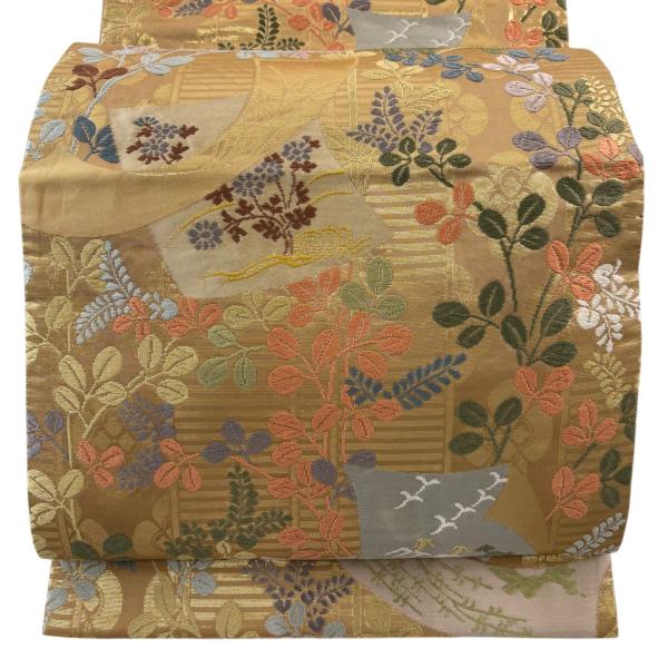 袋帯 秀品 関西仕立て 花唐草 鳥 唐織 箔 ベージュ 六通 正絹 中古