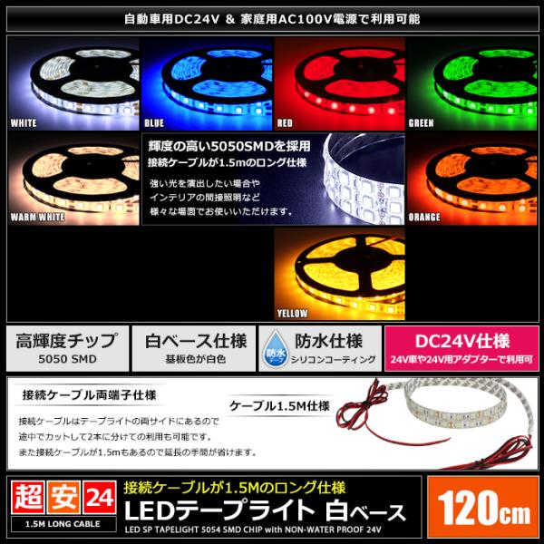 LEDテープライト 防水 24V 120cm 3チップ 白ベース ケーブル1.5m 両端子