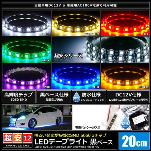 LEDテープライト 2本入り 防水 12V 20cm 3チップ 黒ベース ケーブル12cm