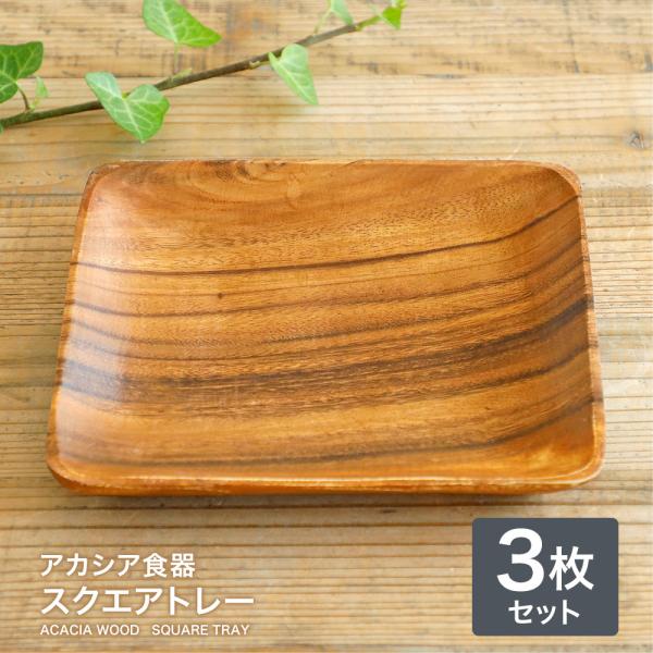 アカシア食器 スクエアトレー (3枚セット) 天然木 アカシア 木製食器 角皿 洋食器 和食器 小物入れ カフェ アウトドア BBQ おしゃれ かわいい 北欧 ナチュラル