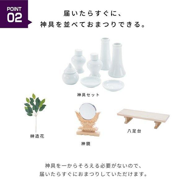 神具7点、神鏡、榊造花などお祀りに必要な神具がセットになった、こだわり派の方にもオススメの神棚セットです。
