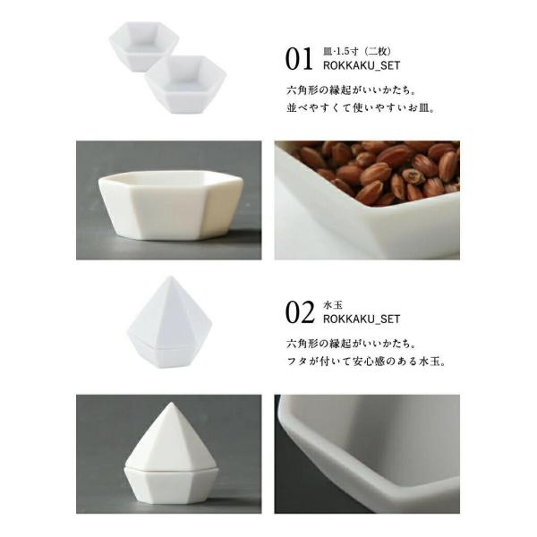 水玉、皿は縁起のいい六角形の陶器をチョイス。