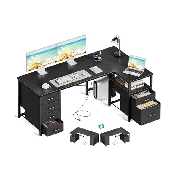 AODK パソコンデスク 引き出し6杯付き ゲーミングデスク コンセント付き l字デスク 机 幅140 pcデスク 棚付き desk 収納 ワークデスク 在宅勤務 仕事用 オフィス