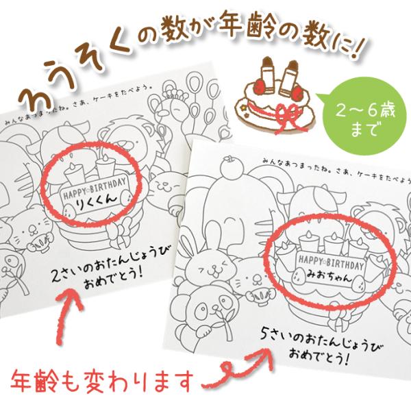 表紙と塗り絵用紙11枚に、ご希望の名前を印刷でき、動物たちが「○○ちゃん、おめでとう」(○○は名前)と誕生日をお祝いしてくれます。バースデーケーキのページは、キャンドル本数をお子様の年齢本数に合わせられ、プレートにも名入れを施します。
