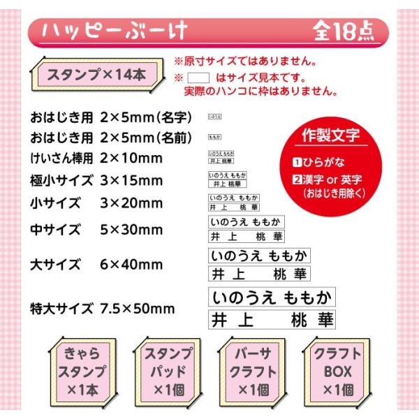 こちらは、ひらがなと漢字のお名前スタンプ14本にキャラスタンプ1本、おしゃれなクラフトボックス、インクパッド、パーサクラフトがついた18点セットです★